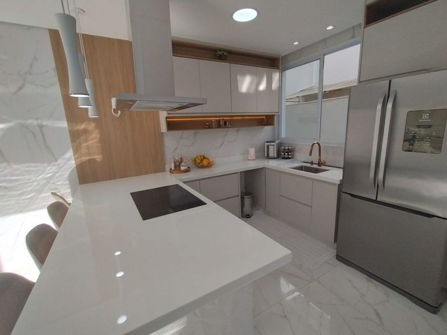Cozinha planejada com ilha em Super Nanoglass branco
